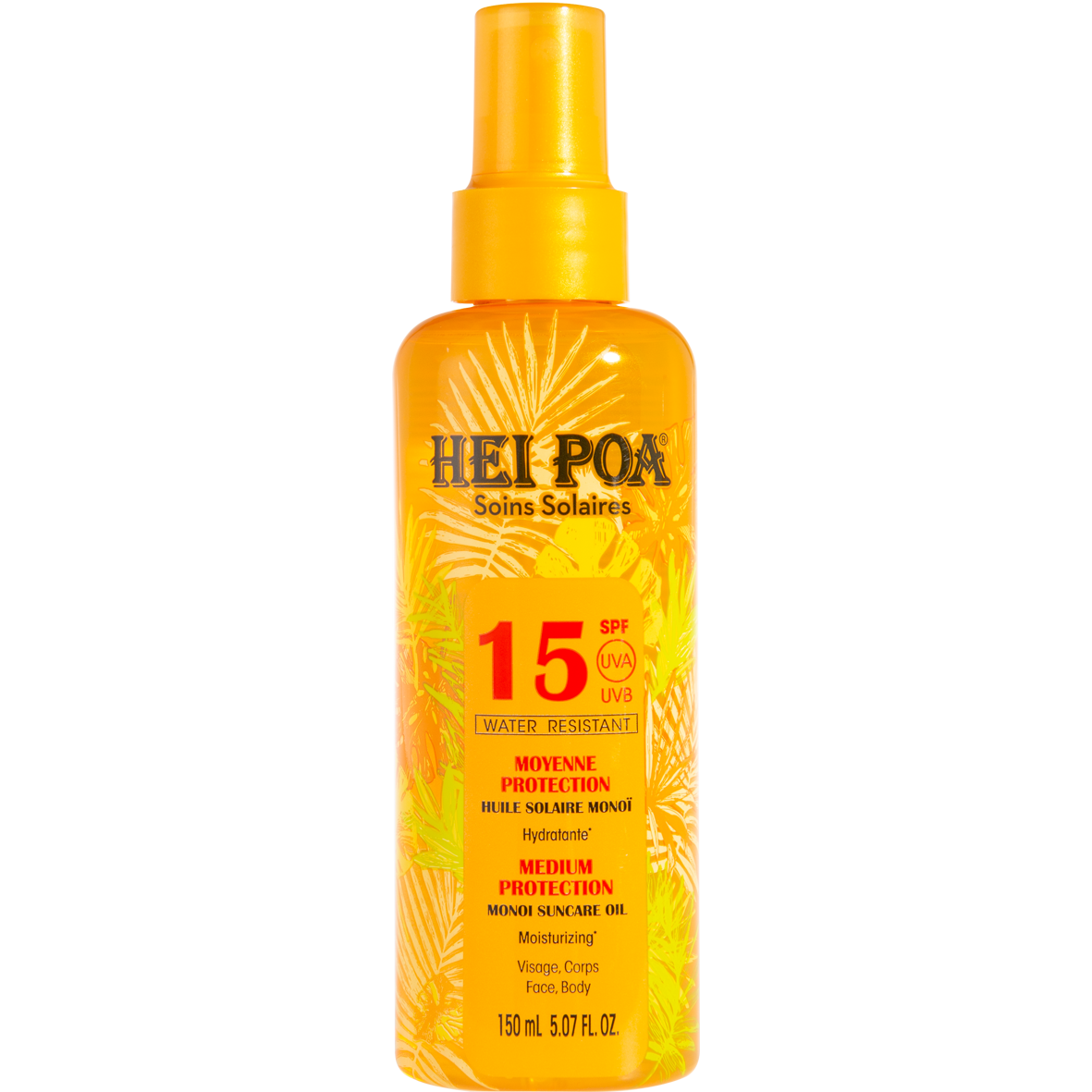 L'huile solaire au Monoï SPF15 d'Hei Poa nourrit, hydrate et protège des rayons UV le visage et le corps.