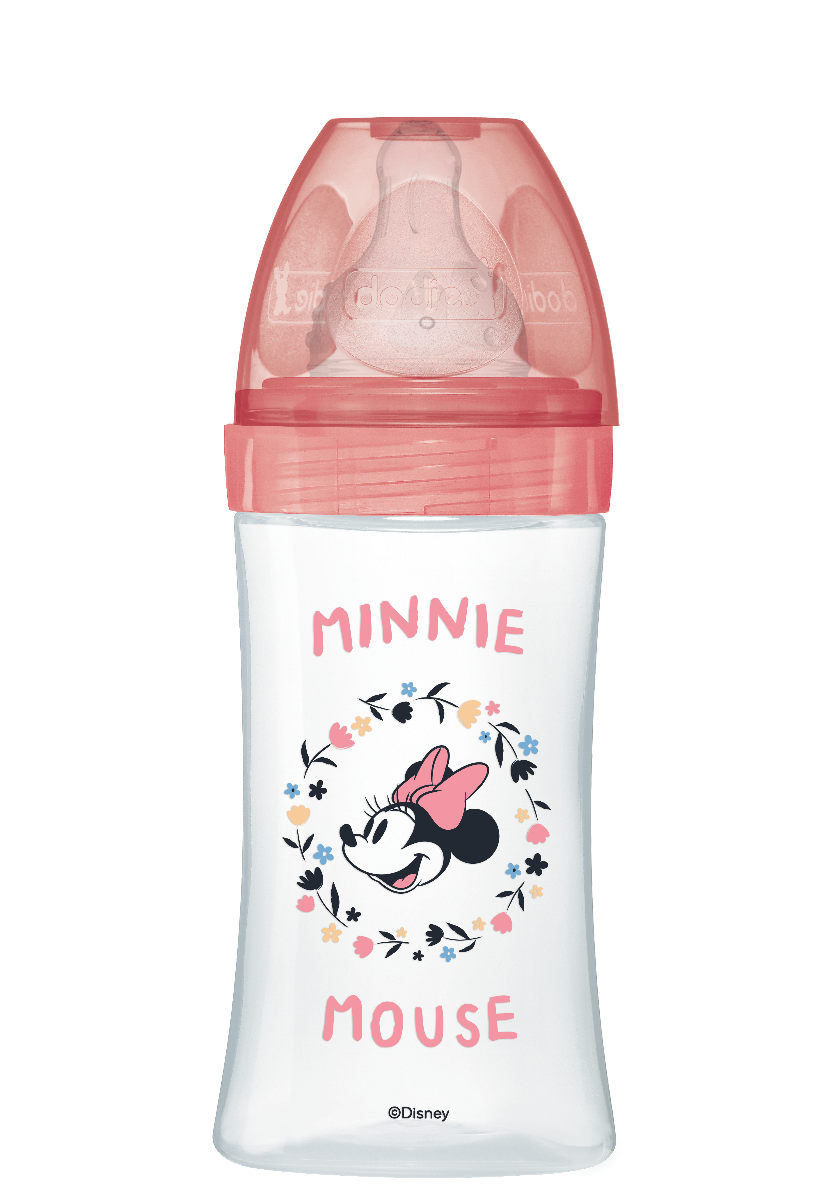 Biberon Initiation+ 270mL, décors Minnie Rose, équipé d'une tétine ronde 3 vitesses débit moyen. Son système anti-colique est intégré à la tétine grâce à une double valve brevetée, qui favorise la circulation de l'air et réduit les risques de coliques, d'aérophagie et de régurgitations.