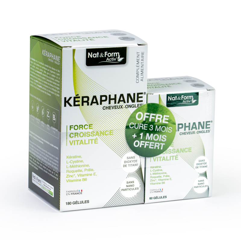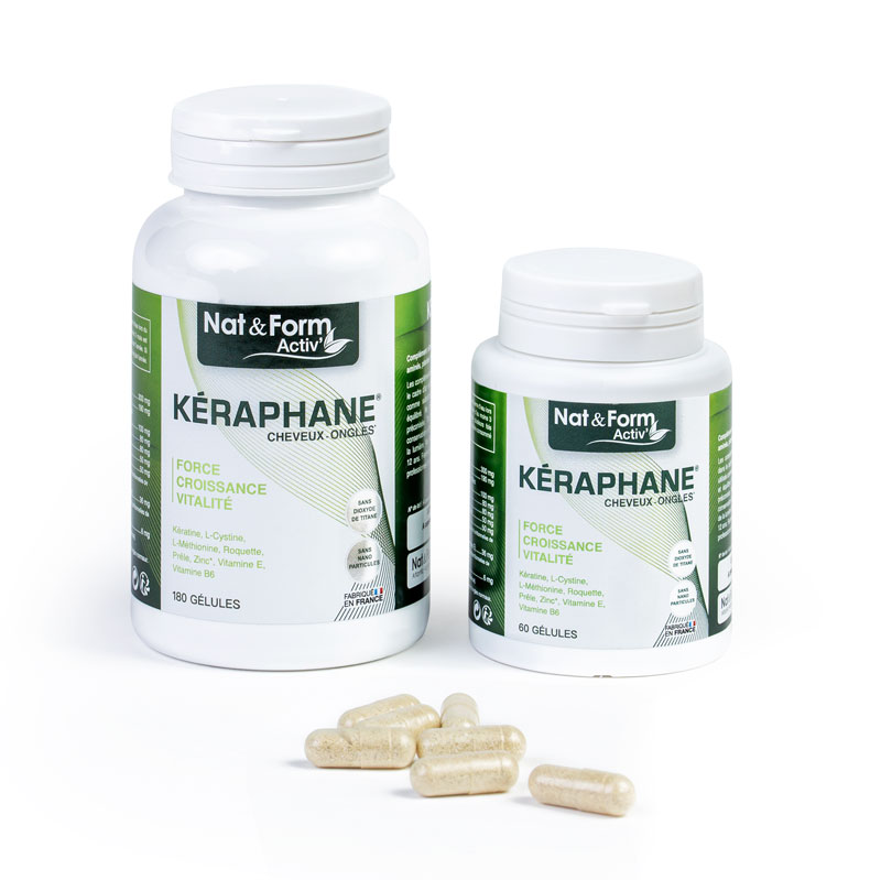 Kéraphane Cheveux et ongles Nat et Form est un complément alimentaire, il contient de la kératine qui est essentiel pour les cheveux et les ongles. Il est conçue pour favoriser la croissance et la fortification des cheveux ainsi que la stimulation du bulbe capillaire qui favorise la pousse du cheveux.