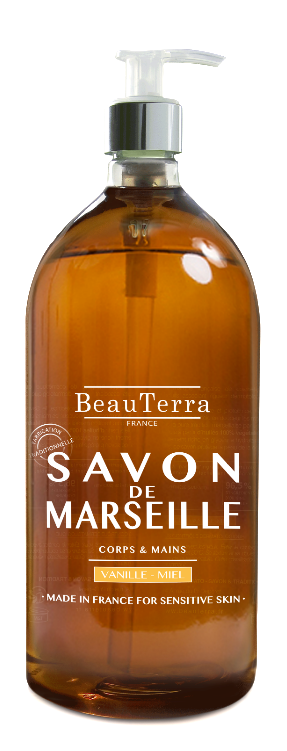 Enrichi en huile d'olive nourrissante et protectrice, le savon liquide de Marseille Beauterra nettoie en douceur les mains et le corps.