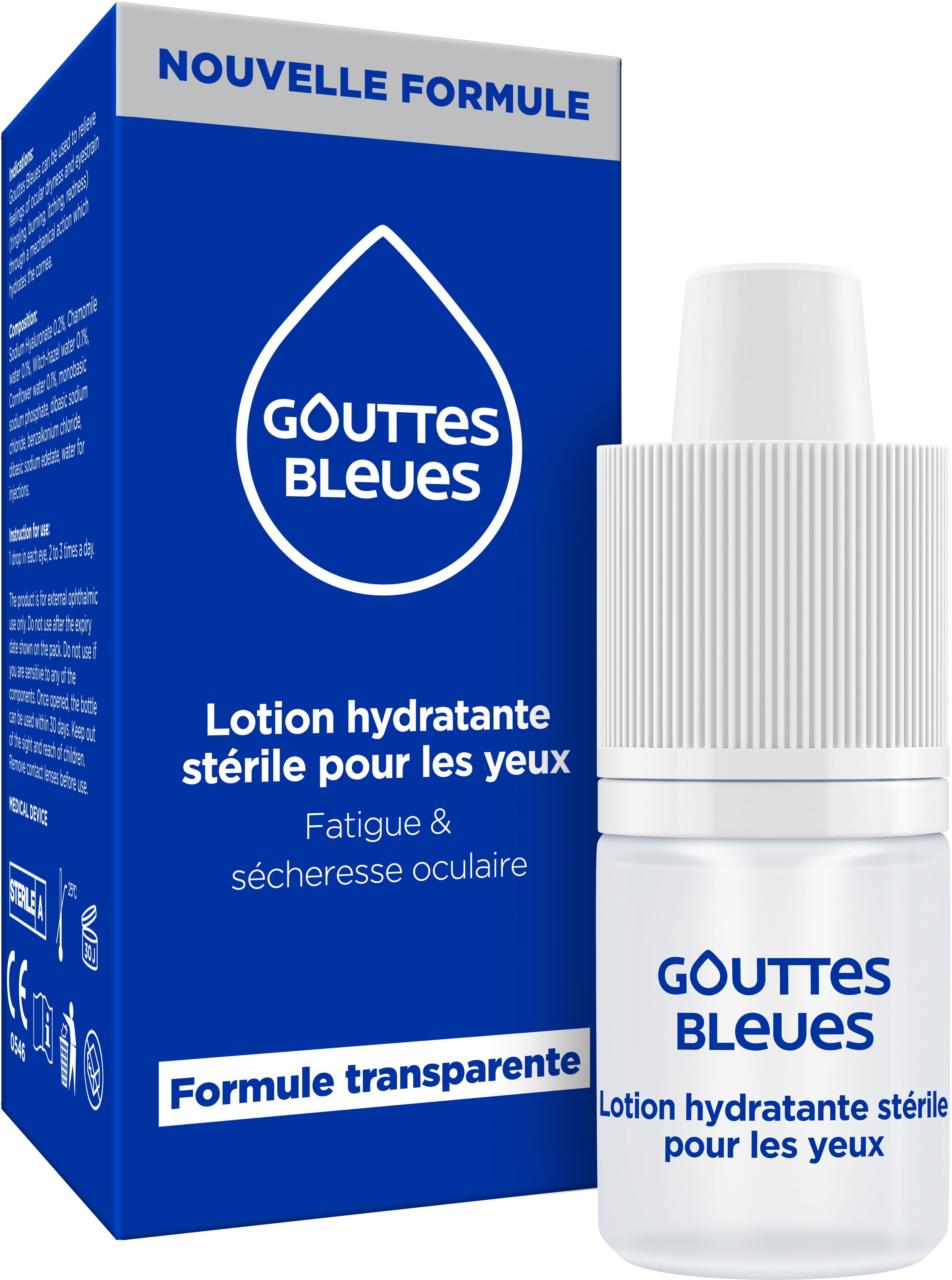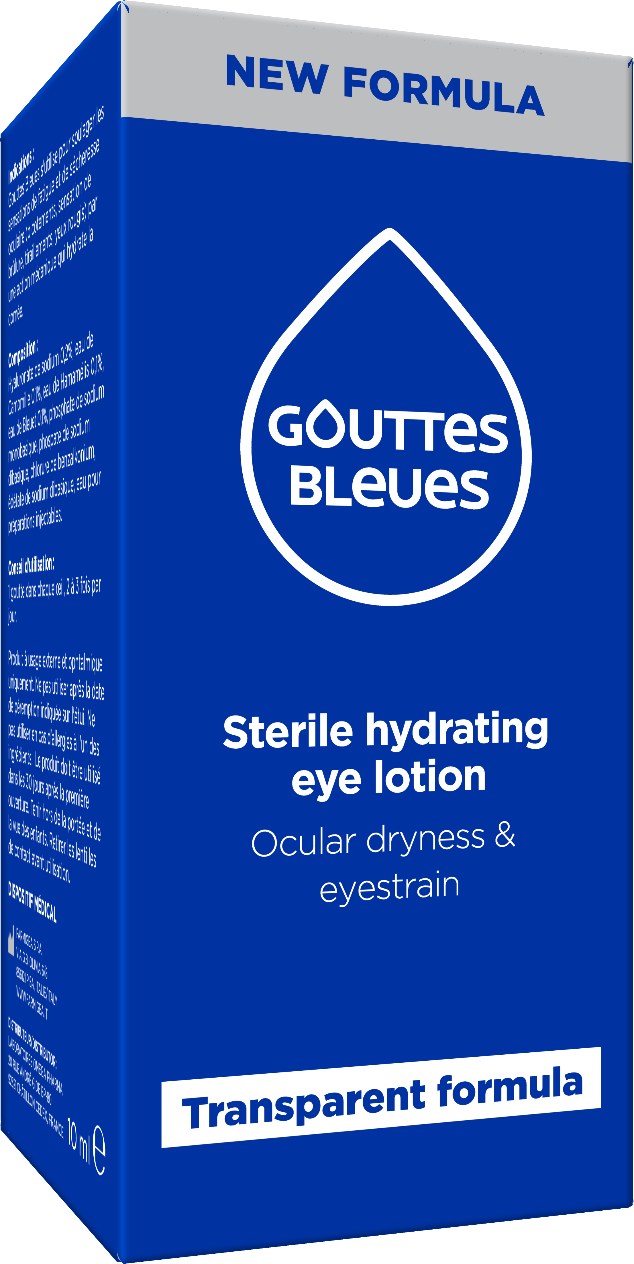 Gouttes Bleues s'utilise pour soulager les sensations de fatigue et de sécheresse oculaire (picotements, sensation de brûlure, tiraillements, yeux rougis) par une action mécanique qui hydrate la cornée.