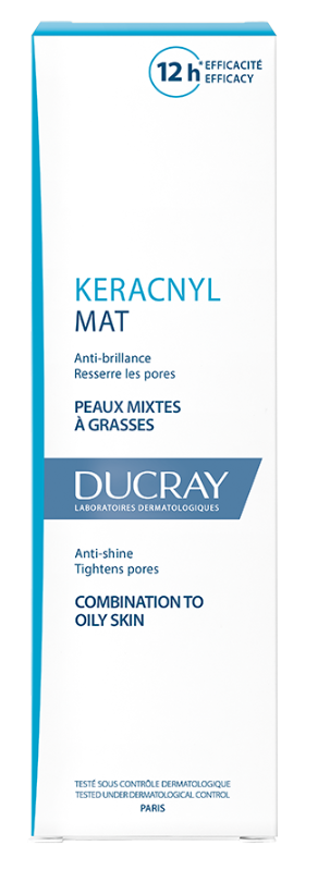 Keracnyl Mat est une crème pour les peaux mixtes à grasses. Ce soin offre une efficacité pendant 12 heures contre la brillance pour une peau matifiée. Il permet également de resserrer les pores de la peau pour un grain de peau affiné jour après jour et un teint plus éclatant. Cette crème laisse une peau fraîche et confortable ! Non comédogène et fabriqué en France.