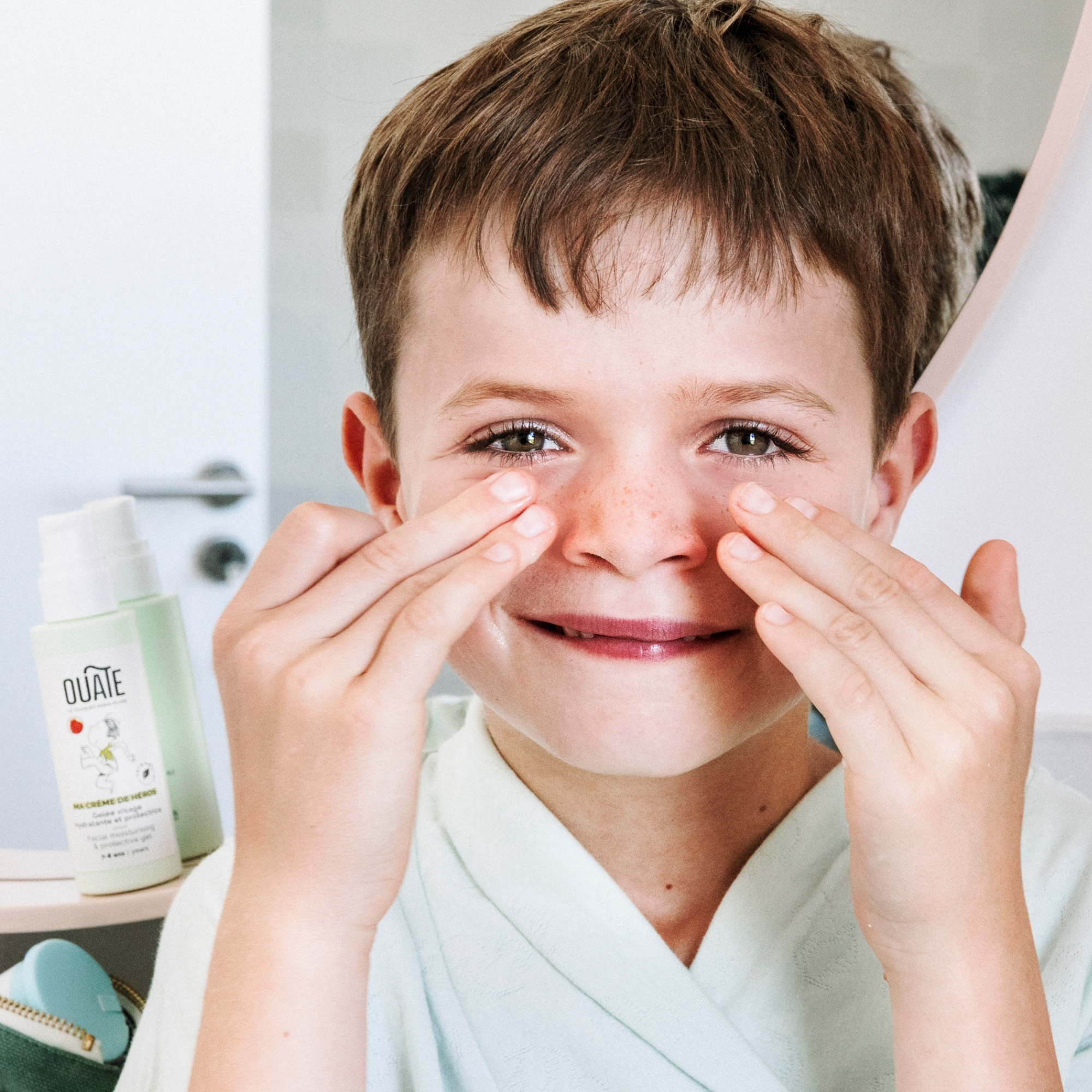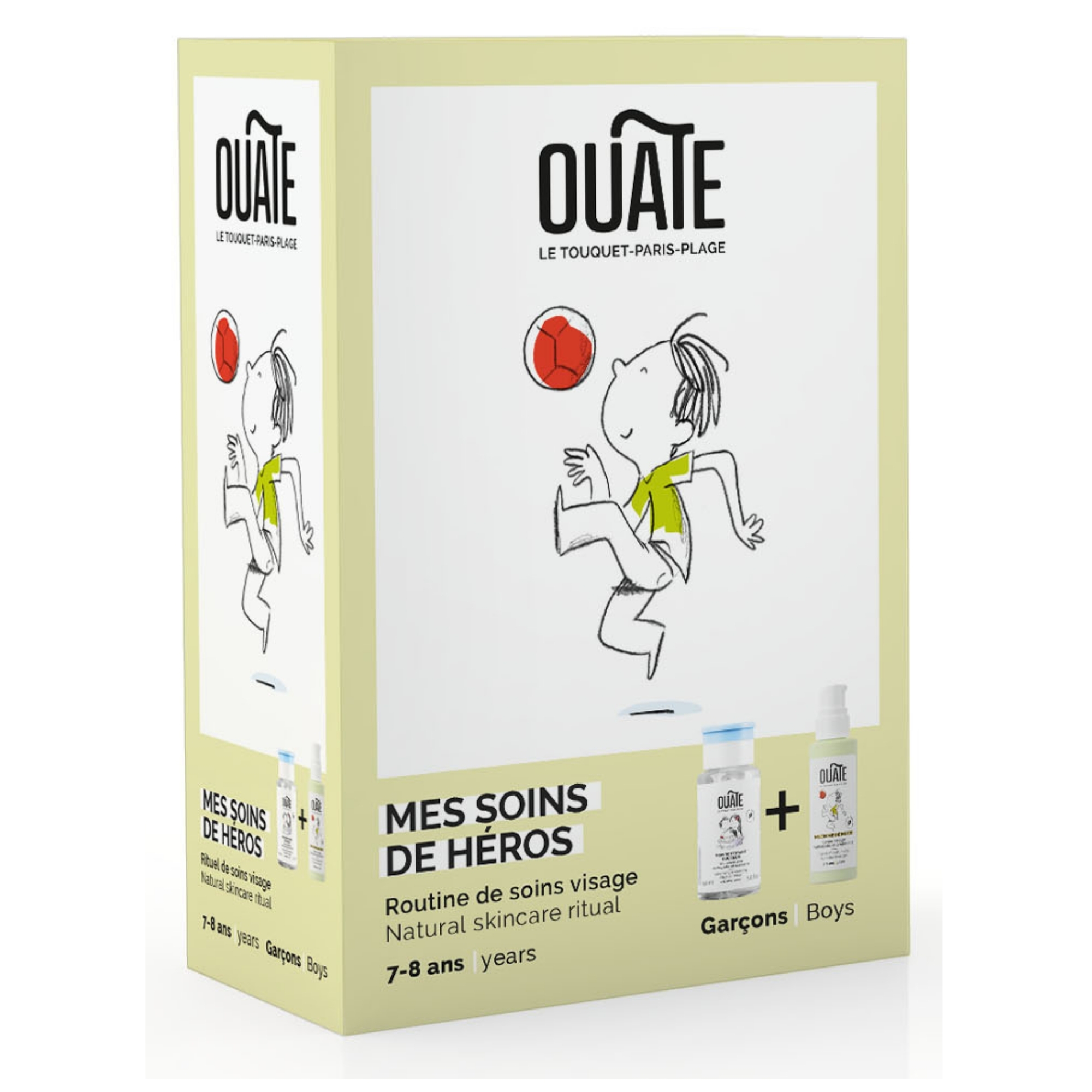 La routine soin visage des garçons de 7-8 ans se fait en deux étapes : on nettoie la peau puis on l'hydrate et on la protège. MES SOINS DE HÉROS est donc composée de deux produits : MON NETTOYANT DOUCEUR et MA CREME DE HÉROS .