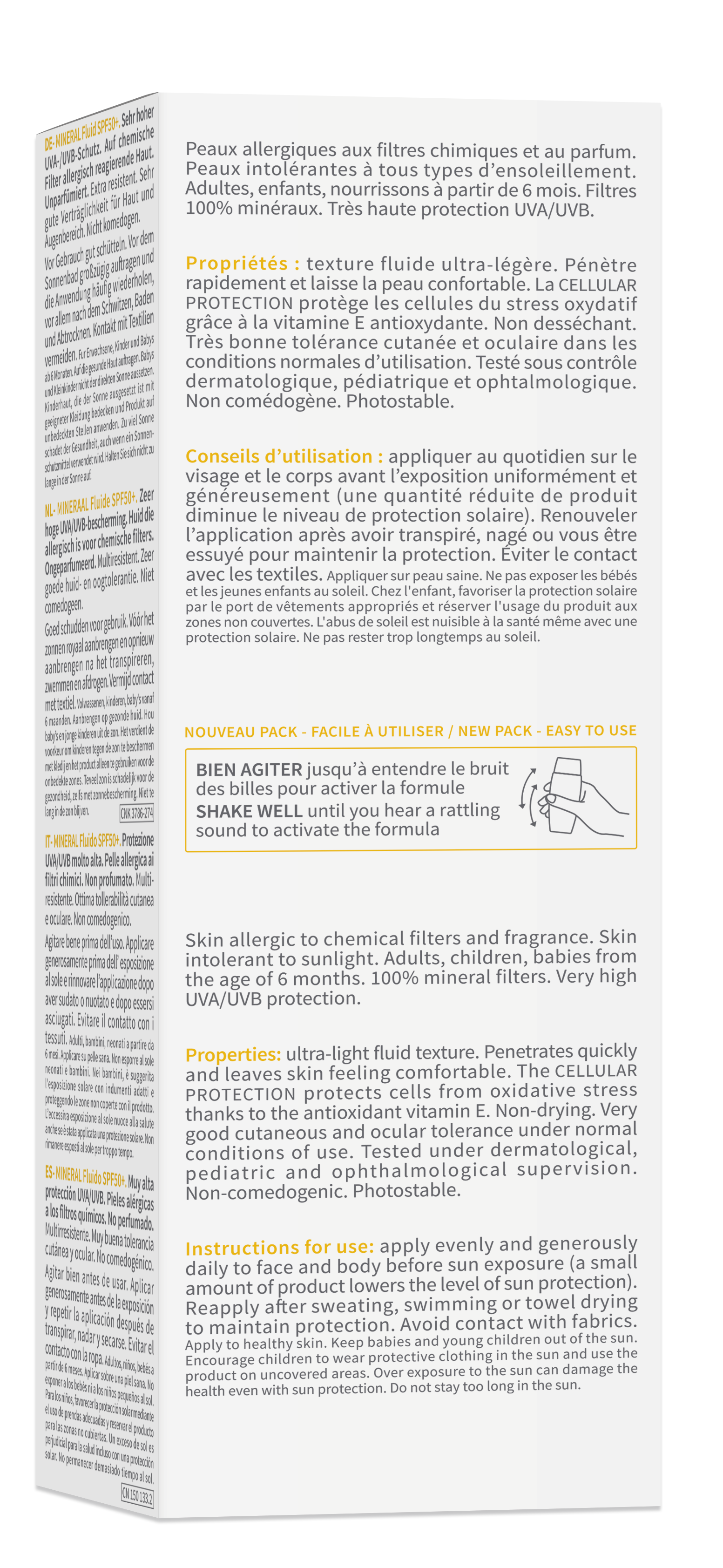 Testé sous contrôle dermatologique, pédiatrique et ophtalmologique. Non comédogène. Photostable.