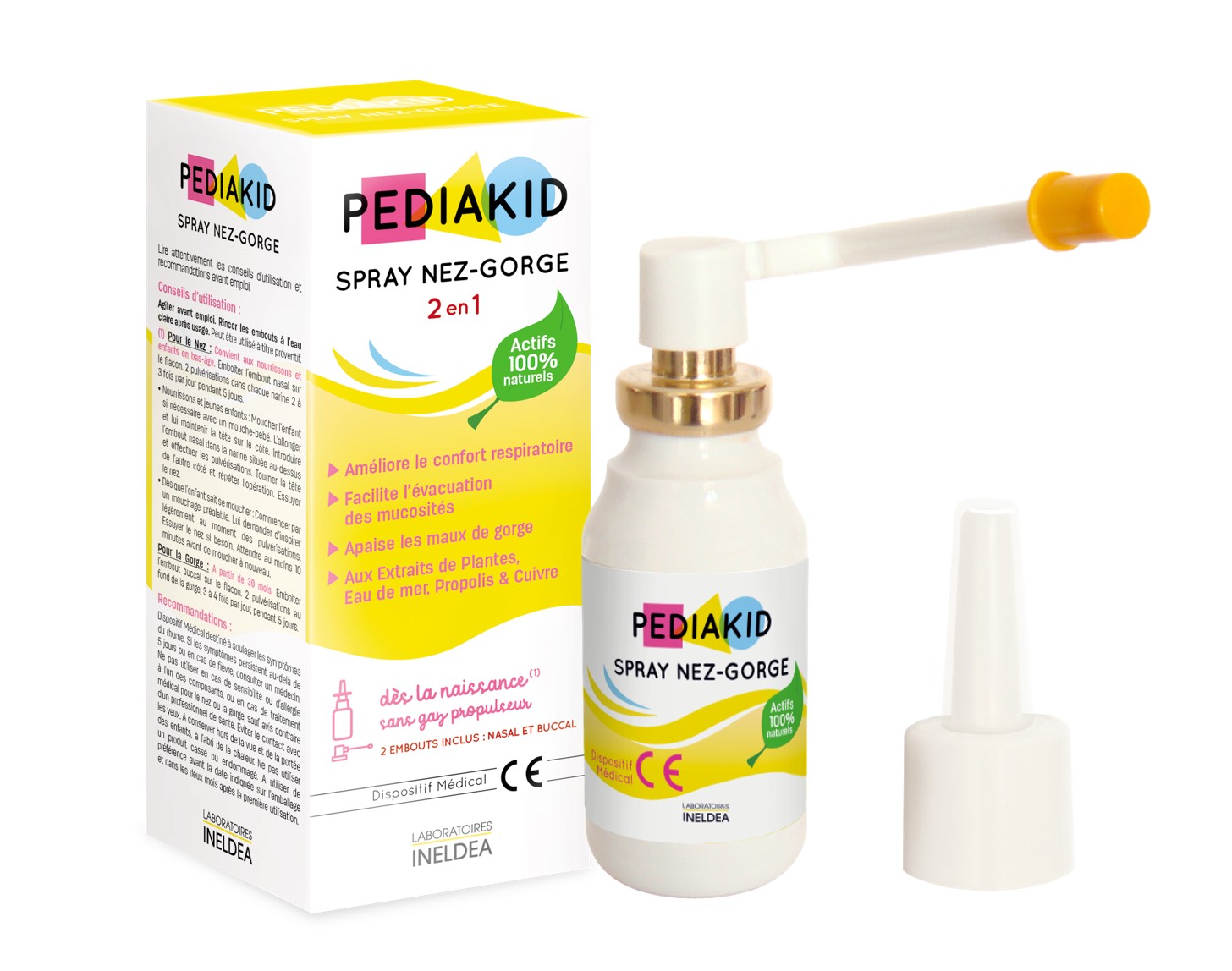 Le dispositif médical en spray Nez et Gorge PediaKid est conçu pour soulager les symptômes du rhume chez les enfants. Un embout nasal et un embout buccal sont fournis dans la boîte.
