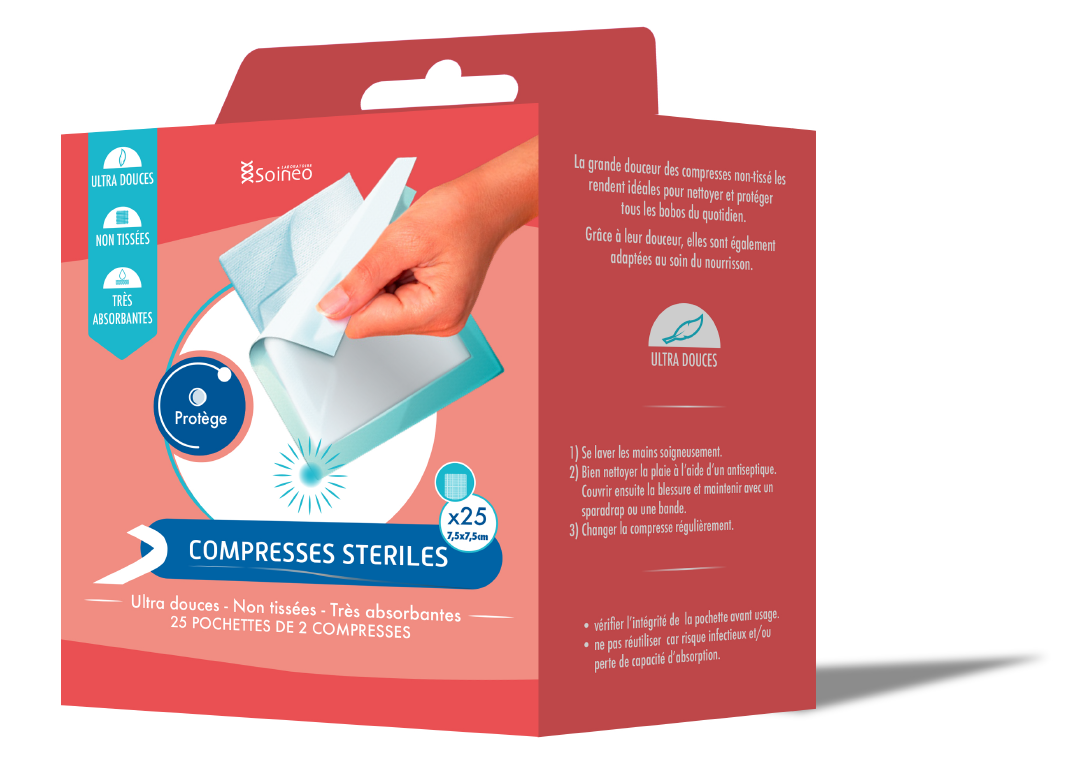 Les compresses Soineo sont souples et absorbantes. Elles peuvent être utilisées pour le nettoyage et la protection des plaies.