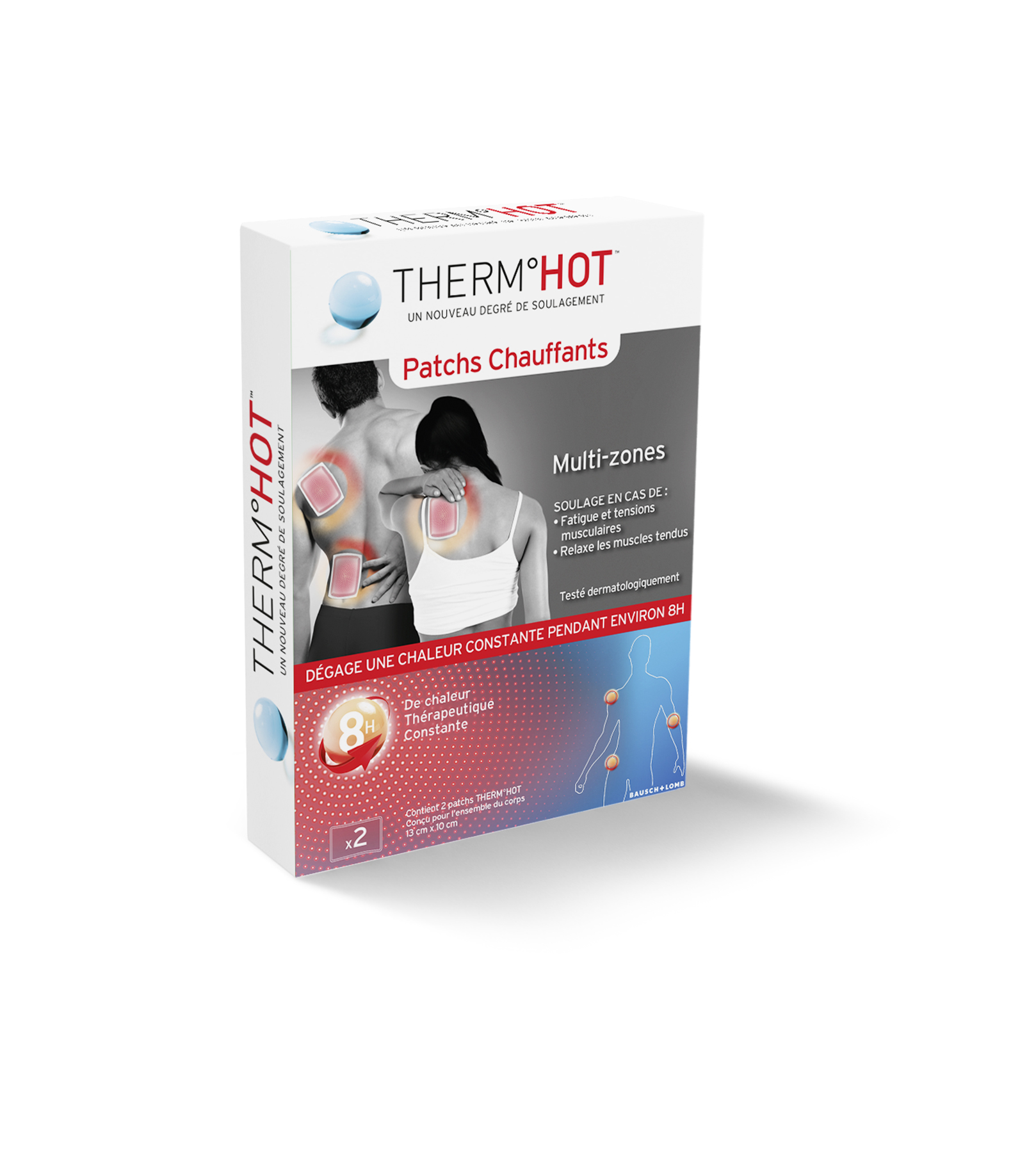 Les pacths chauffants Therm°Hot permettent de soulager les zones du corps en cas de fatigue, tensions musculaires et d'arthrose. Ils dégagent de la chaleur pendant 8 heures afin de détendre les muscles. Sa forme permet de s'adapter à toutes les zones du corps. Ces patchs ont été testés dermatologiquement pour ne pas irriter la peau. La boîte contient 2 patchs de taille 13 cm x 10 cm.