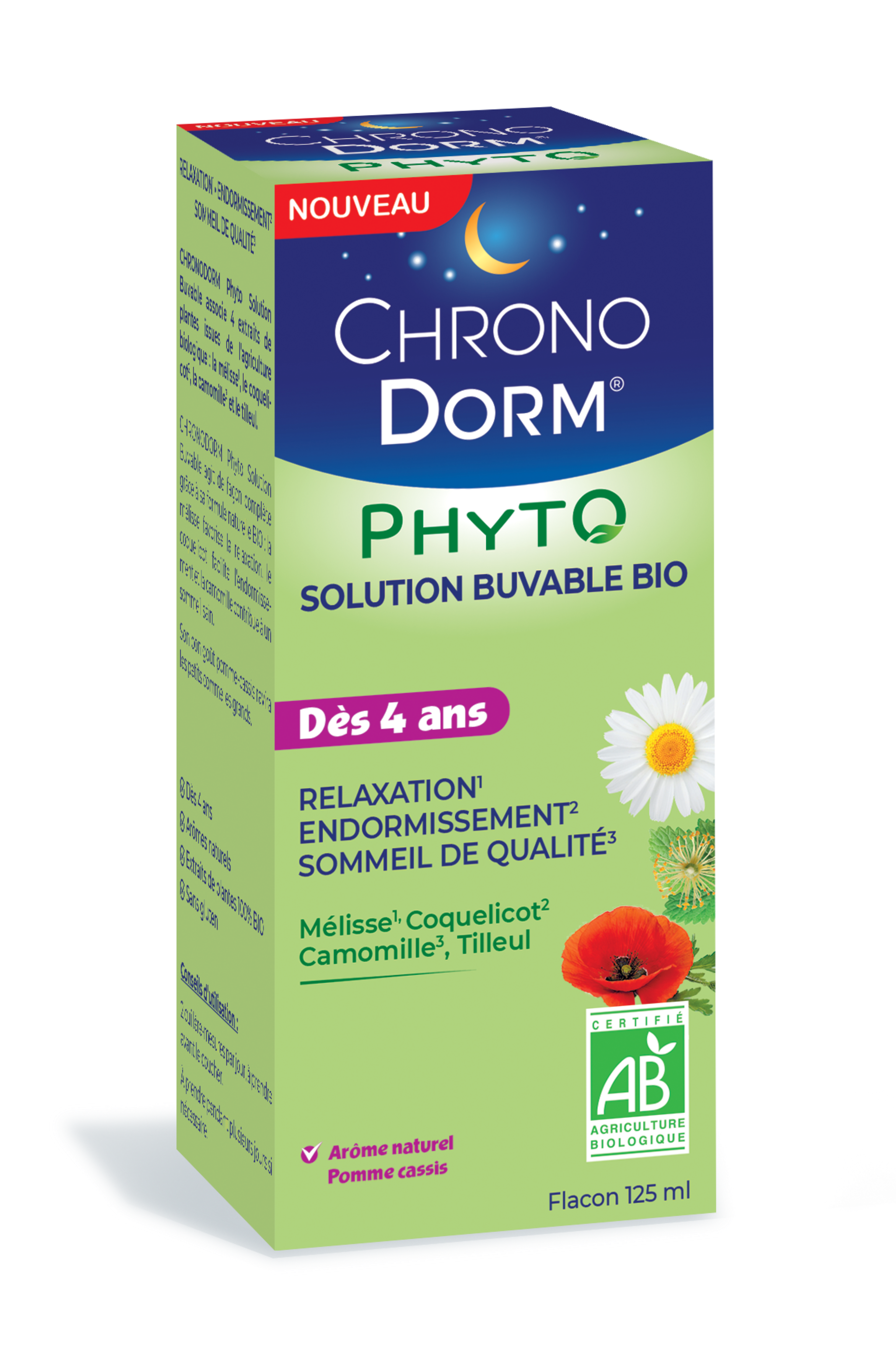 CHRONODORM Phyto Solution Buvable associe 4 extraits de plantes issues de l’agriculture biologique : la mélisse, le coquelicot, la camomille et le tilleul. CHRONODORM Phyto Solution buvable agit de façon complète grâce à sa formule naturelle BIO : la mélisse favorise la relaxation, le coquelicot facilite l’endormissement et la camomille contribue à un sommeil sain.