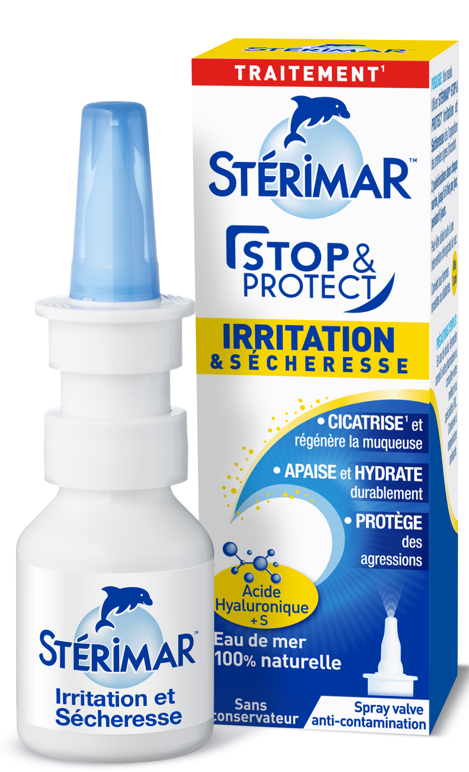 Stérimar Stop & protect Irritations 20ml restaure et hydrate intensément la muqueuse nasale inconfortable et douloureuse.