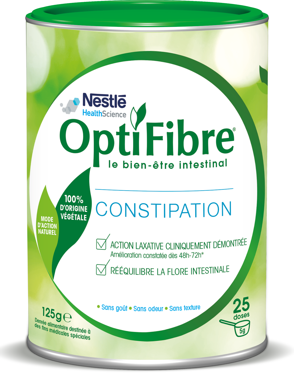 OptiFibre® Constipation est une denrée alimentaire destinée à des fins médicales spéciales pour les besoins nutritionnels des patients en cas de constipation. A utiliser sous contrôle médical.