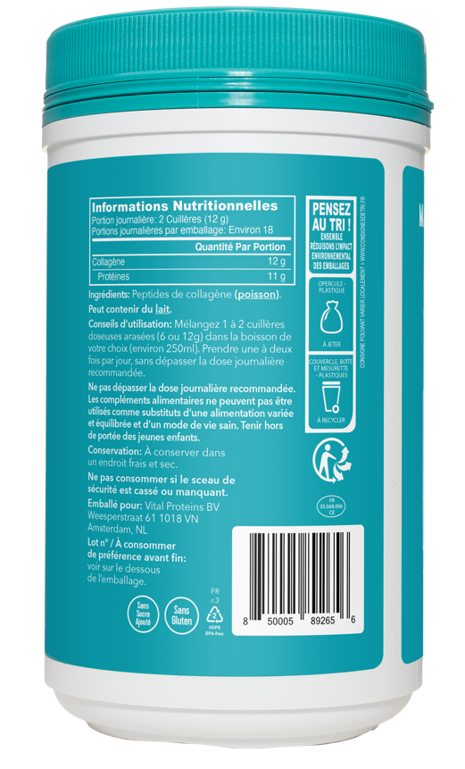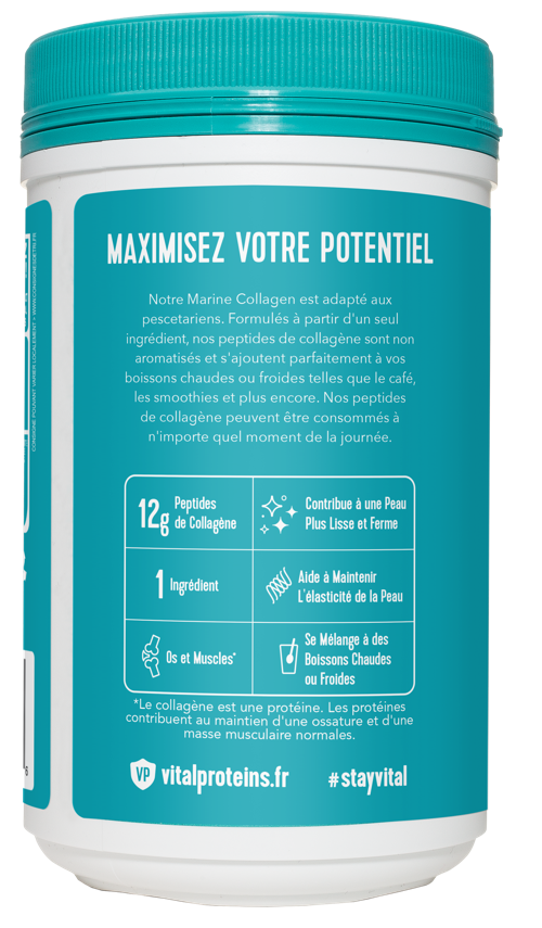 Sans sucre, sans gluten et sans produit laitier et sans arôme il s'intègre facilement dans le thé, le café ou les smoothies pour maximiser les bénéfices. Chaque portion de Marine Collagen Vital Proteins® contient 12g de collagène, ce qui participe au maintien d’une ossature et d’une masse musculaire normales.