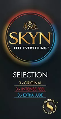 Les préservatifs SKYN sont composés de polyisoprène, ils ne contiennent pas de latex de caoutchouc naturel afin de convenir aux personnes allergiques au latex. SKYN Selection est une sélection de 3 types de préservatifs : SKYN Original pour des sensations naturelles, SKYN Intense Feel pour des sensations intenses et SKYN Extra Lubrifié pour un confort optimal. Cette nouvelle génération de préservatifs est fabriquée en SKYNFEEL®, une matière révolutionnaire sans latex, douce et confortable pour procurer une sensation de ne rien porter. Elle offre aux deux partenaires des sensations naturelles et sensuelles tout en leur permettant de découvrir leur préférence. Ces préservatifs sont de couleur naturelle et leur largeur nominale est de 53 mm.
