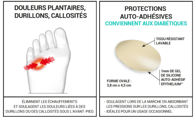Les protections Epitact spéciales durillons protègent les pieds des durillons et soulagent les douleurs sous l'avant du pied. Très fines, elles peuvent aussi être porté dans des chaussures fermées. Ces protections peuvent etre utilisé par des personnes diabètiques.
