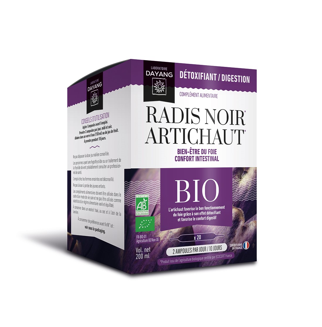 Le complexe radis noir artichaut BIO DAYANG associe harmonieusement 2 produits bien connus des consommateurs. Au cœur du complexe radis noir artichaut BIO DAYANG, l’artichaut, par son effet détoxifiant, favorise le bon fonctionnement du foie. Traditionnellement utilisé pour le drainage de l’organisme, il stimule les fonctions d’élimination. L’artichaut aide à favoriser la digestion et participe au confort intestinal. Conditionné en France.