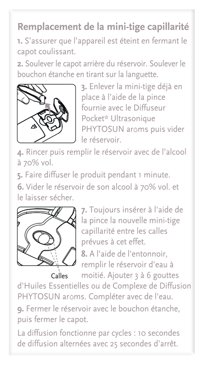 - 3. A l’aide de l’entonnoir, remplir le réservoir d’eau à moitié. Ajouter 3 à 6 gouttes d’Huiles Essentielles ou de Complexe de diffusion PHYTOSUN arôms. Compléter avec de l’eau.