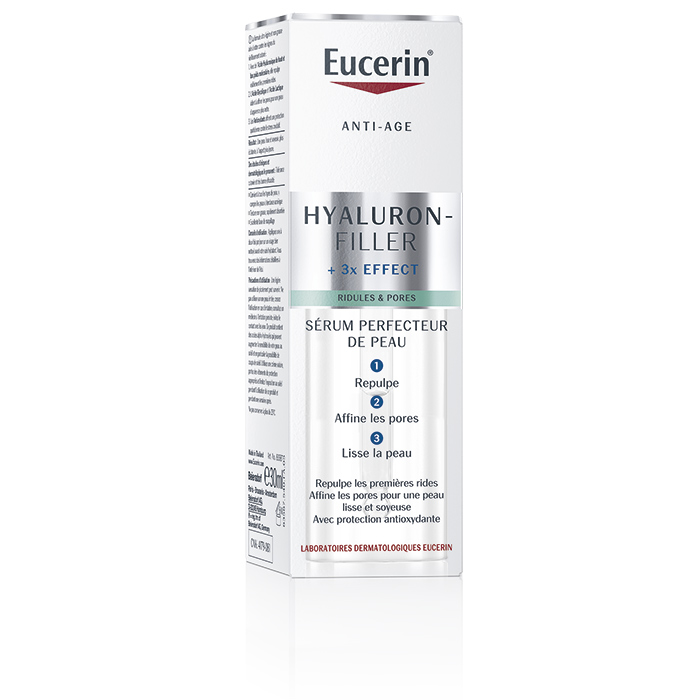 Le sérum perfecteur de peau Hyaluron Filler d'Eucerin est recommandé dès l'apparition des premières rides et ridules et est adpaté à tous les types de peaux, même à tendance acnéique. Ce sérum anti-âge diminue les imperfections de la peau et donne un aspect lisse et pétillant à votre visage. Un soin composé d'acide hyaluronique, idéal pour repulper et hydrater la peau en profondeur en lui redonnant une bonne élasticité. Sa texture non grasse facilite son utilisation et ne demande pas de temps de pose, le sérum pénètre rapidement.