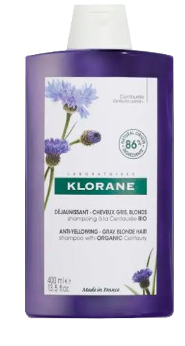 Le shampoing Déjaunissant à la Centaurée de Klorane ravive l'éclat des cheveux et les déjaunies. Destiné aux cheveux blancs ou gris, ce shampoing, grâce à ses pigments végétaux aux nuances bleutées, apporte de délicats reflets argentés et diminue le jaunissement. Les cheveux sont doux et plus faciles à coiffer.