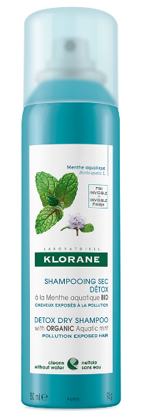 Le shampoing sec Détox à la Menthe Aquatique Bio de Klorane nettoie et élimine les particules polluantes en 2 minutes, sans mouiller les cheveux. Il aide à protéger de la pollution et rafraîchit la chevelure. Son fini invisible est idéal pour des retouches rapides en journée.