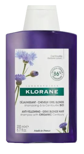 Le shampoing Déjaunissant à la Centaurée de Klorane ravive l'éclat des cheveux et les déjaunies. Destiné aux cheveux blancs ou gris, ce shampoing, grâce à ses pigments végétaux aux nuances bleutées, apporte de délicats reflets argentés et diminue le jaunissement. Les cheveux sont doux et plus faciles à coiffer.
