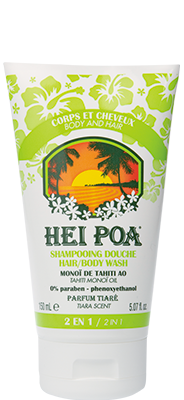 Le shampoing douche hydratant d'Hei Poa au Monoï de Tahiti nettoie tout en prenant soin du corps et des cheveux de toute la famille. La peau est hydratée et les cheveux sont plus brillants et plus faciles à coiffer. Il est formulé sans savon.