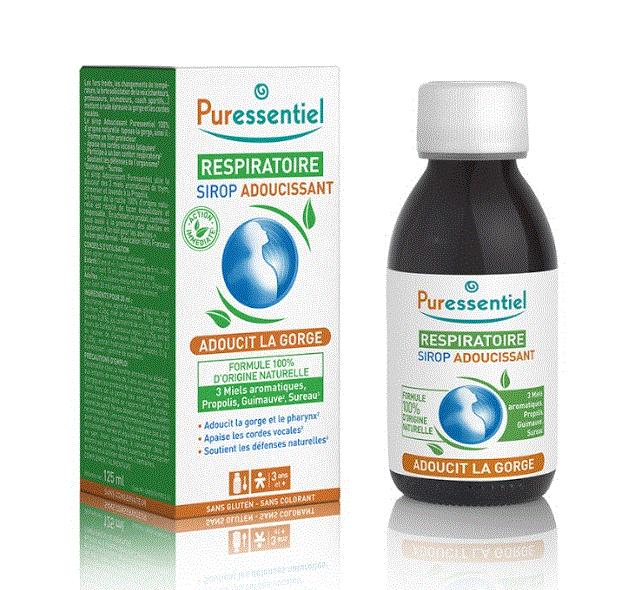 Le Sirop Adoucissant Respiratoire Puressentiel est recommandé en cas d'irritation de gorge et de pharynx. Ce sirop sans gluten et sans colorant est formulé à base de 3 miels aromatiques pour apaiser les cordes vocales, adoucir la gorge et soutenir les défenses naturelles de l'organisme. Il est 100 % d'origine naturelle, fabriqué en France et convient aux enfants à partir de 3 ans.