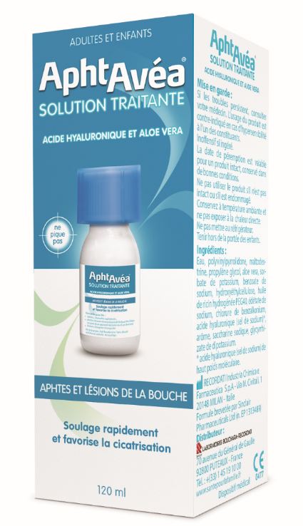 La solution AphtAvéa traitante Acide Hyaluronique et Aloe Vera soulage immédiatement les aphtes et les lésions de la bouche et aide à la cicatrisation.