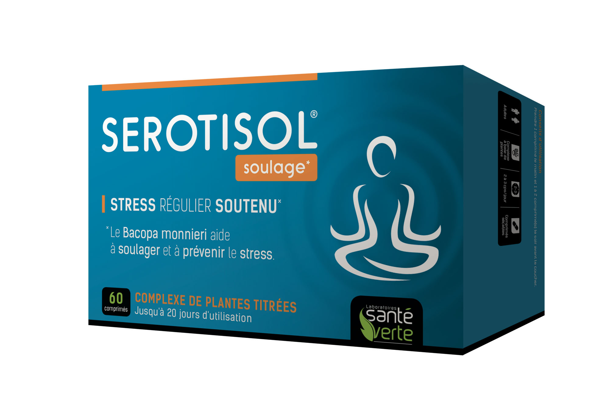 Serositol Soulage du laboratoire Santé Verte est recommandé pour soulager et prevenir le stress régulier soutenu. Il est formulé d'un complexe composé de 3 extraits de plantes reconnues comme le Bacopa monnieri. Réservé à l’adulte. Complément alimentaire déconseillé aux femmes enceintes et allaitantes. Ne pas associer avec la prise d’antidépresseurs.