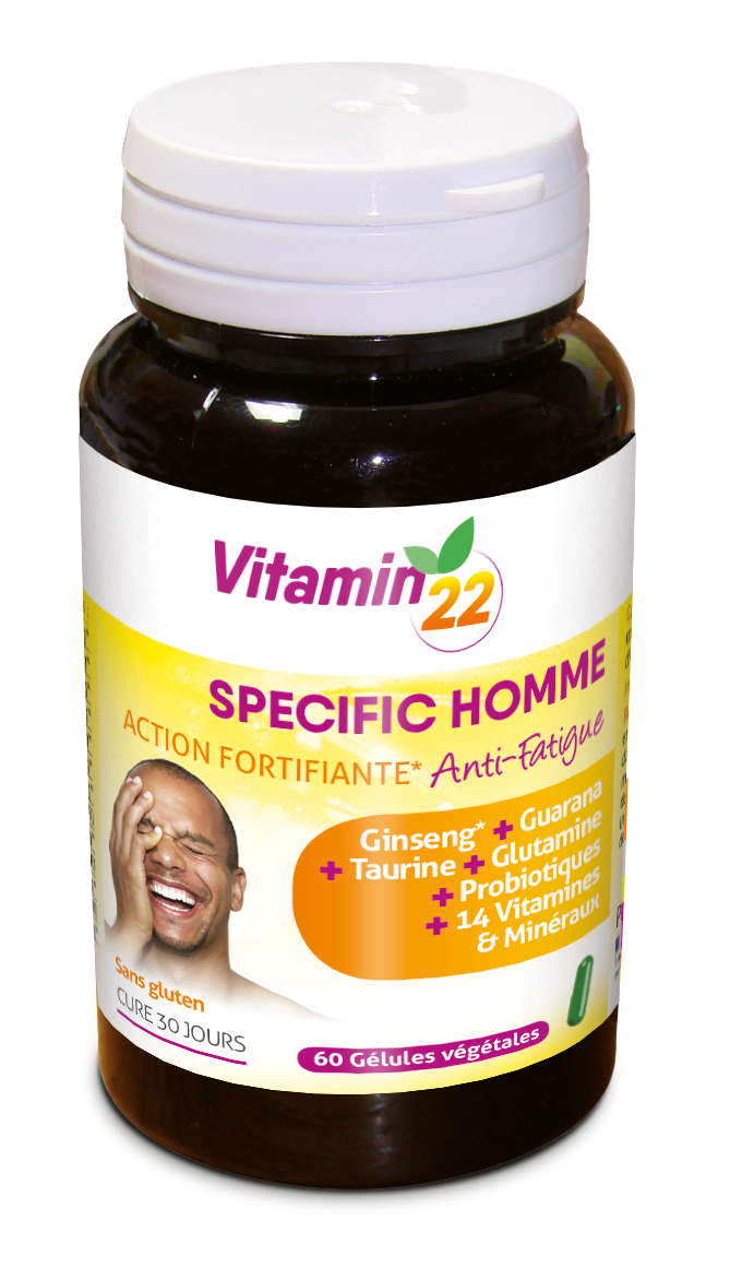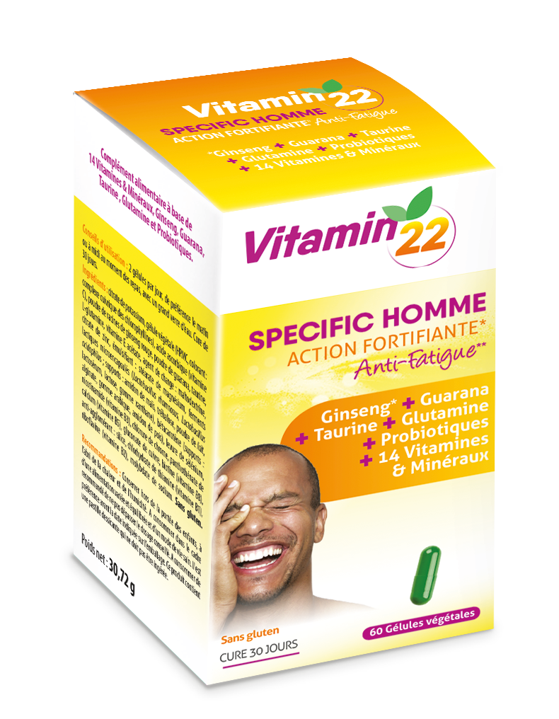 Association unique de Ferments lactiques, 8 Vitamines, 6 Minéraux, Extraits de plantes et Acides aminés, VITAMIN’22 SPECIFIC HOMME a été spécialement élaboré pour apporter à l’organisme de l’homme les nutriments essentiels venant compléter judicieusement son alimentation pour soutenir sa santé.