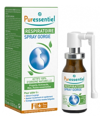 Le spray gorge Puressentiel Respiratoire est conçu pour apaiser la gorge, les cordes vocales ainsi que le pharynx. Il s'agit d'un complément alimentaire aidant au bon fonctionnement du système respiratoire. Formulé à base d'huiles essentielles de menthe et de thym, il ne contient pas de colorant, pas de conservateur, pas d'arôme de synthèse ni de gluten. C'est une huile essentielle botaniquement et biochimiquement définie (HEBBD).
