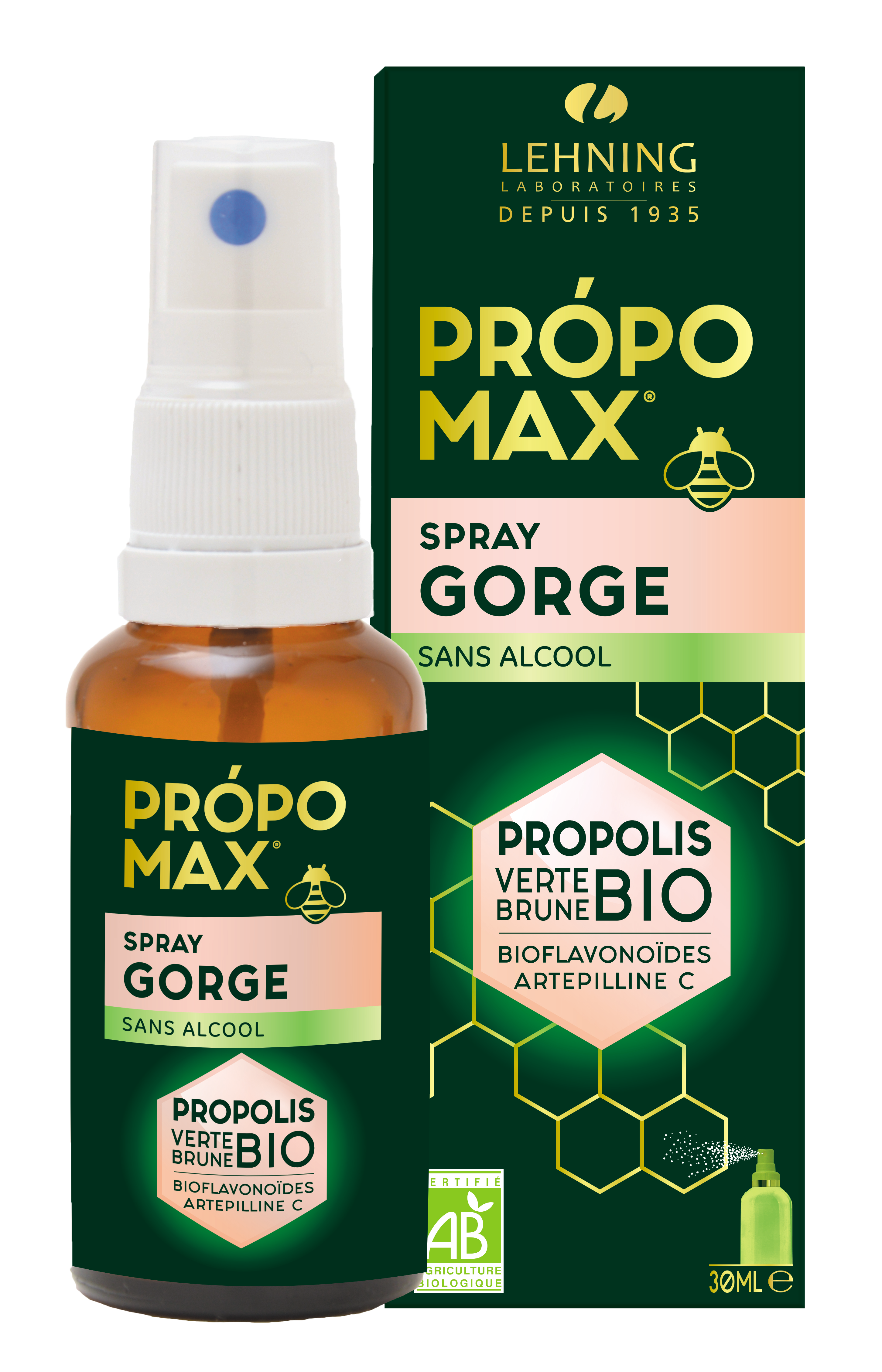 Spray Gorge sans alcool Própomax, à l'extrait de propolis verte bio. Aide à adoucir la gorge.