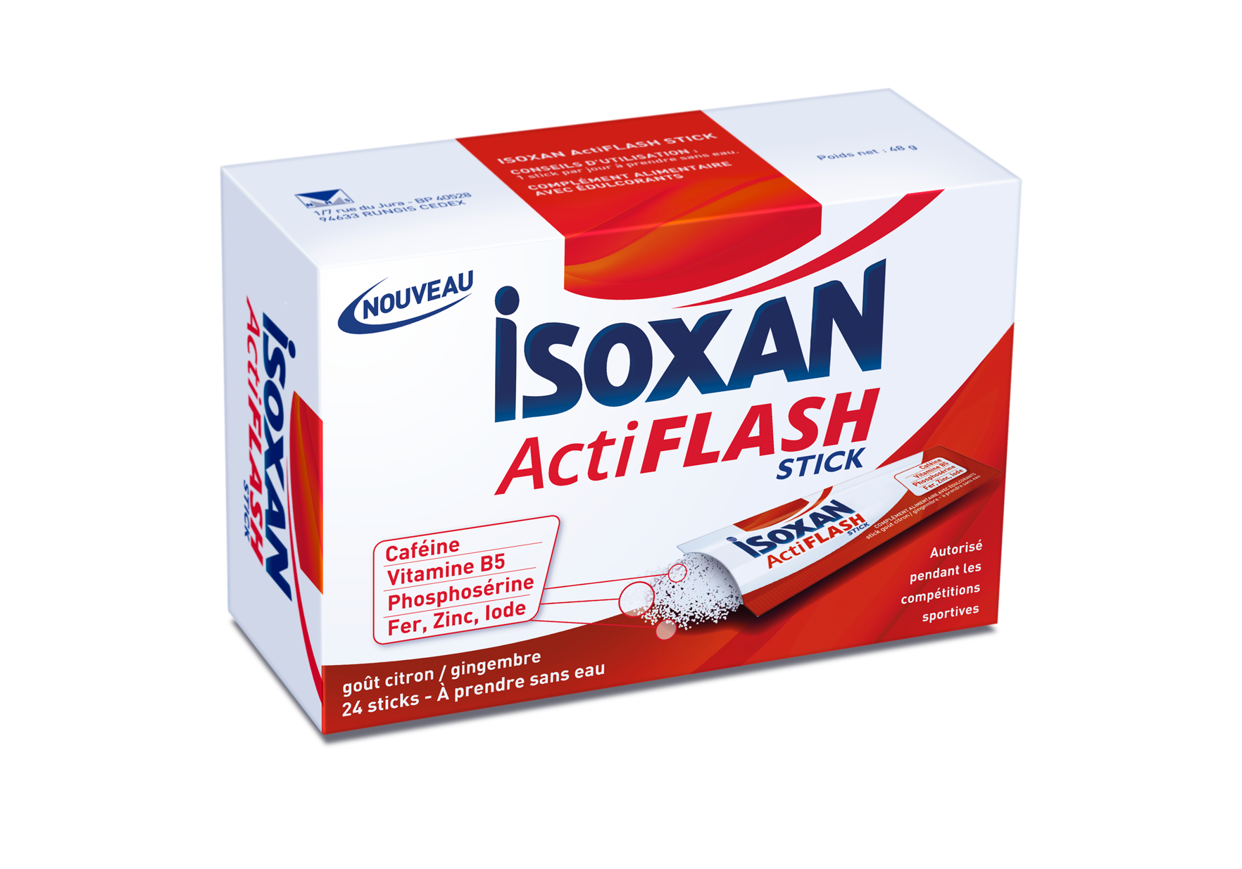 ISOXAN ActiFlash est un complément alimentaire sous forme de stick à base de caféine, vitamine B5, Phosphosérine, Fer, Zinc et Iode pour un regain d'énergie immédiat. Permet de réduire la fatigue, favorise la concentration et performances intellectuelles tout en contribuant au métabolisme énergétique. Ce stick est au goût citron et gingembre. Il s'agit d'un complément alimentaire conforme à la norme AFNOR sur la réglementation anti-dopage.