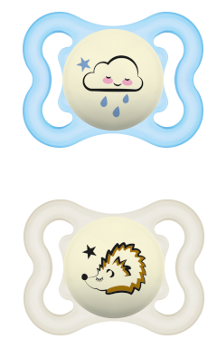 La sucette anatomique est en silicone. Sa téterelle en forme symétrique permet à la sucette d'être toujours bien positionnée pour ne pas gêner au développement naturel de la bouche de bébé. Son bouton est phosphorescent et brille dans la nuit, ce qui permettra à papa et maman de facilement la retrouver.