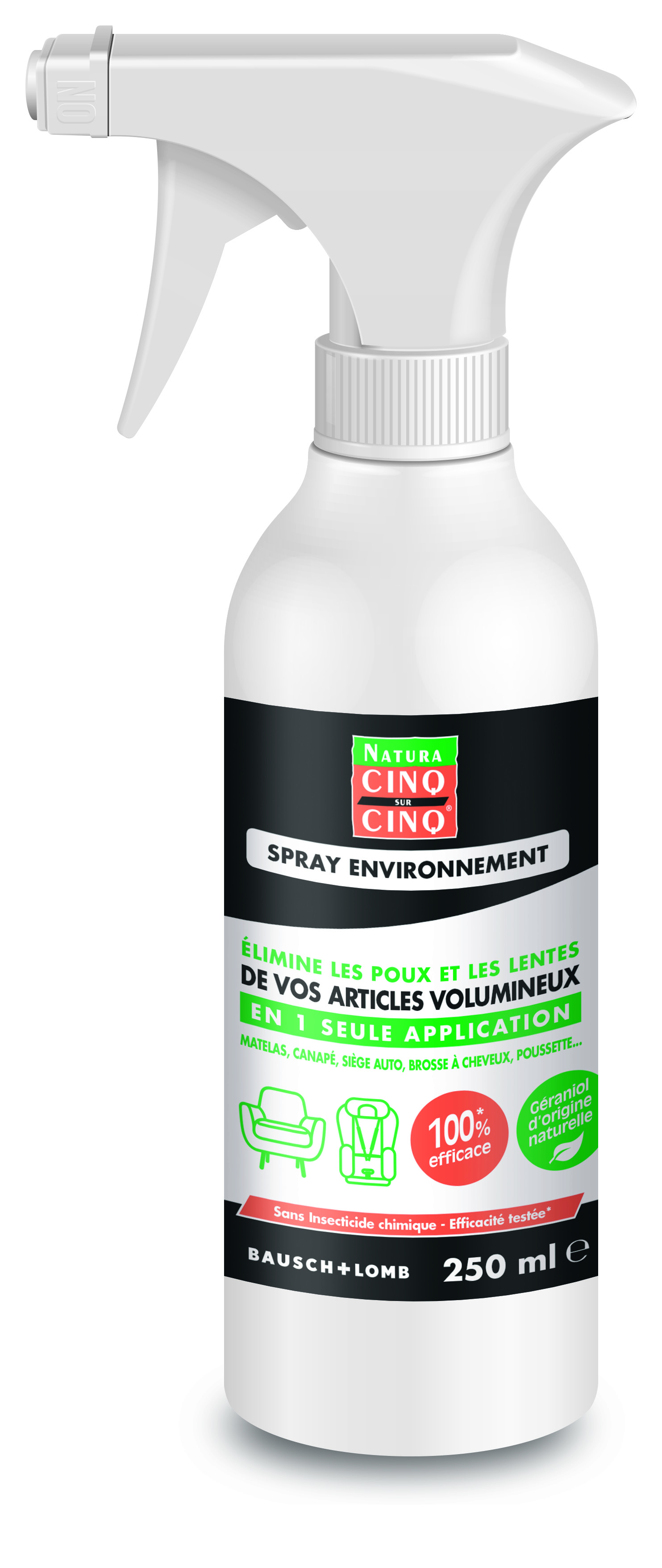 Le traitement environnement anti-poux et lentes Cinq sur Cinq contient un additif lessive pour les texitles et un spray pour les grandes sufaces et les objets qui permettent de traiter les infestations de poux et de lentes même sur des articles difficiles à laver.