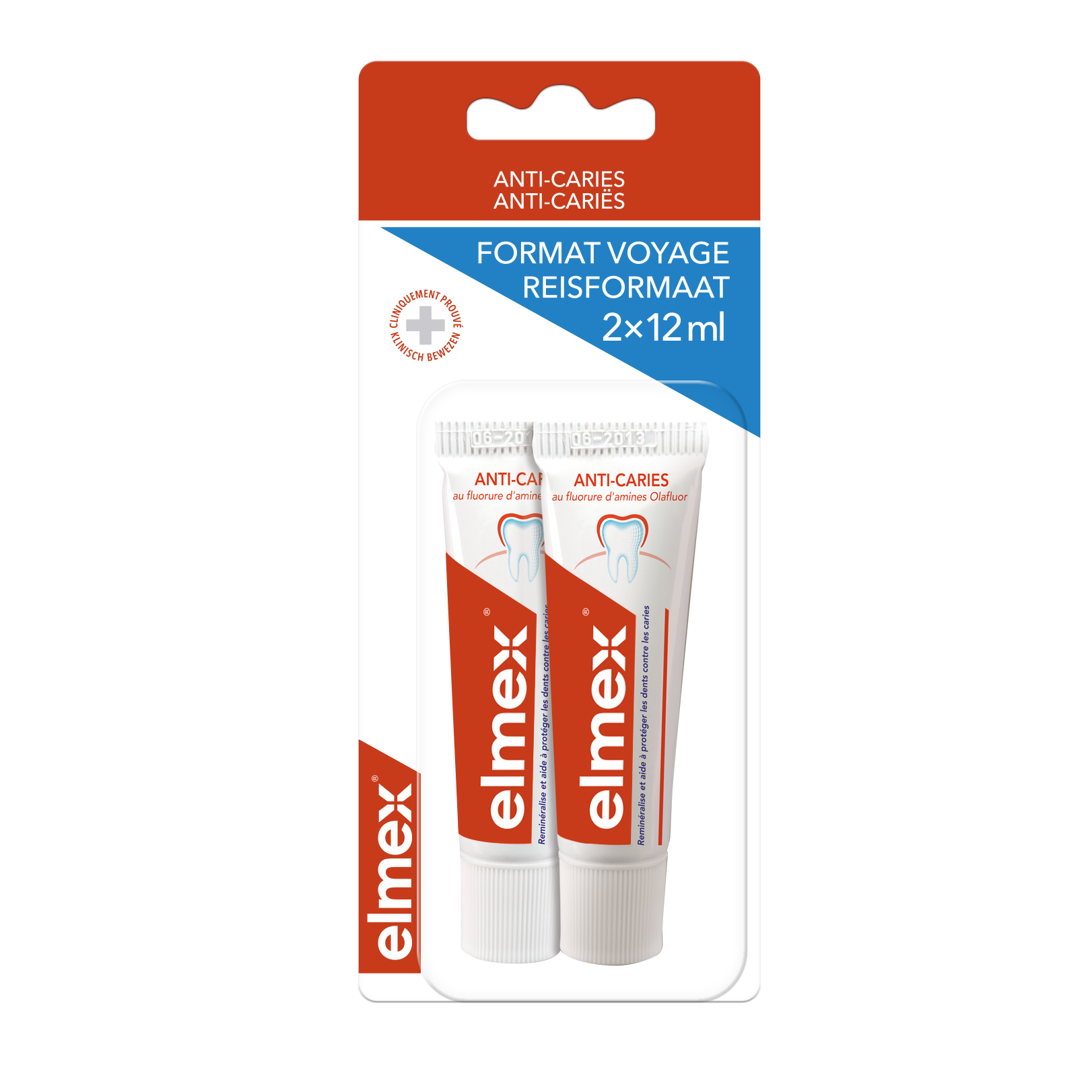 Elmex Dentifrice Protection Caries Tubes de Voyage contient du fluorure d'amines Olafluor qui se fixe sur l'émail, stimule sa reminéralisation et le rend plus résistant à l'attaque acide des bactéries de la plaque dentaire.